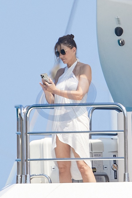 Semi-Exclusif - Prix Spécial - No web - Elizabeth Hurley et son fils Damian, Joan Collins et son mari Percy Gibson passent la journée sur un yacht au large de Saint-Tropez, le 13 août 2024. Si Damian a choisi de se baigner, Elizabeth Hurley semblait hésiter entre plusieurs glaces sur la carte proposée par un marchand itinérant. Récemment, Damian Hurley est passé derrière la caméra pour réaliser le film "Strictly Confidential" avec sa mère dans le rôle principal. Semi-Exclusive - Special Price - No web - Elizabeth Hurley and her son Damian, Joan Collins and her husband Percy Gibson spend the day on a yacht off the coast of Saint-Tropez, August 13, 2024. While Damian chose to go for a swim, Elizabeth Hurley seemed to be hesitating between several ice creams on the menu offered by a traveling vendor. Recently, Damian Hurley stepped behind the camera to direct the film "Strictly Confidential" with his mother in the lead role.
