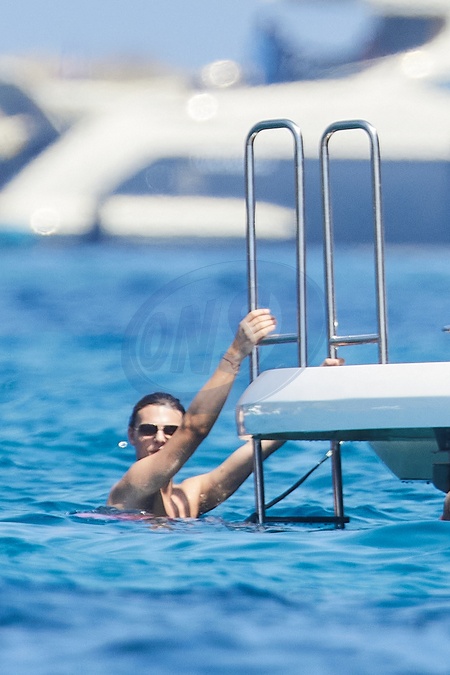 Semi-Exclusif - Prix Spécial - No web - Elizabeth Hurley et son fils Damian, Joan Collins et son mari Percy Gibson passent la journée sur un yacht au large de Saint-Tropez, le 13 août 2024. Si Damian a choisi de se baigner, Elizabeth Hurley semblait hésiter entre plusieurs glaces sur la carte proposée par un marchand itinérant. Récemment, Damian Hurley est passé derrière la caméra pour réaliser le film "Strictly Confidential" avec sa mère dans le rôle principal. Semi-Exclusive - Special Price - No web - Elizabeth Hurley and her son Damian, Joan Collins and her husband Percy Gibson spend the day on a yacht off the coast of Saint-Tropez, August 13, 2024. While Damian chose to go for a swim, Elizabeth Hurley seemed to be hesitating between several ice creams on the menu offered by a traveling vendor. Recently, Damian Hurley stepped behind the camera to direct the film "Strictly Confidential" with his mother in the lead role.