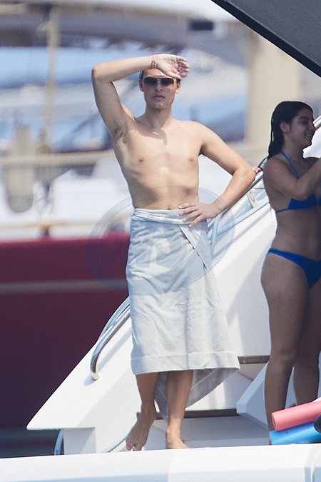Semi-Exclusif - Prix Spécial - No web - Elizabeth Hurley et son fils Damian, Joan Collins et son mari Percy Gibson passent la journée sur un yacht au large de Saint-Tropez, le 13 août 2024. Si Damian a choisi de se baigner, Elizabeth Hurley semblait hésiter entre plusieurs glaces sur la carte proposée par un marchand itinérant. Récemment, Damian Hurley est passé derrière la caméra pour réaliser le film "Strictly Confidential" avec sa mère dans le rôle principal. Semi-Exclusive - Special Price - No web - Elizabeth Hurley and her son Damian, Joan Collins and her husband Percy Gibson spend the day on a yacht off the coast of Saint-Tropez, August 13, 2024. While Damian chose to go for a swim, Elizabeth Hurley seemed to be hesitating between several ice creams on the menu offered by a traveling vendor. Recently, Damian Hurley stepped behind the camera to direct the film "Strictly Confidential" with his mother in the lead role.