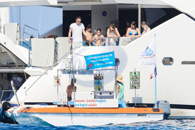 Semi-Exclusif - Prix Spécial - No web - Elizabeth Hurley et son fils Damian, Joan Collins et son mari Percy Gibson passent la journée sur un yacht au large de Saint-Tropez, le 13 août 2024. Si Damian a choisi de se baigner, Elizabeth Hurley semblait hésiter entre plusieurs glaces sur la carte proposée par un marchand itinérant. Récemment, Damian Hurley est passé derrière la caméra pour réaliser le film "Strictly Confidential" avec sa mère dans le rôle principal. Merci de flouter le visage des enfants avant parution. Semi-Exclusive - Special Price - No web - Elizabeth Hurley and her son Damian, Joan Collins and her husband Percy Gibson spend the day on a yacht off the coast of Saint-Tropez, August 13, 2024. While Damian chose to go for a swim, Elizabeth Hurley seemed to be hesitating between several ice creams on the menu offered by a traveling vendor. Recently, Damian Hurley stepped behind the camera to direct the film "Strictly Confidential" with his mother in the lead role. Please pixelate children faces before publishing.