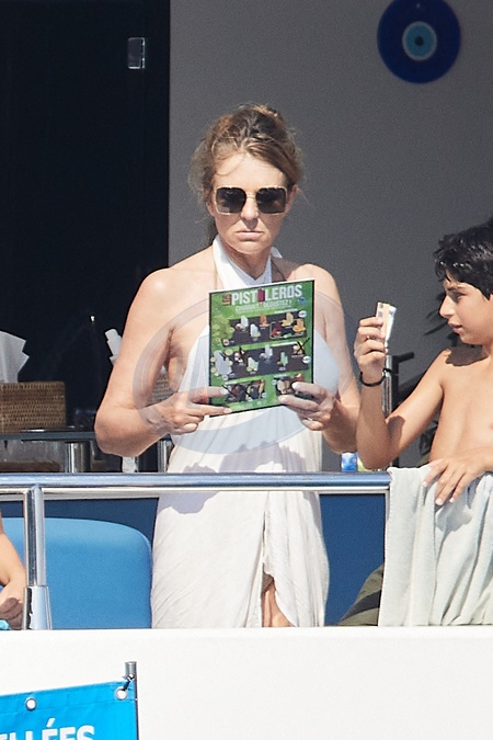 Semi-Exclusif - Prix Spécial - No web - Elizabeth Hurley et son fils Damian, Joan Collins et son mari Percy Gibson passent la journée sur un yacht au large de Saint-Tropez