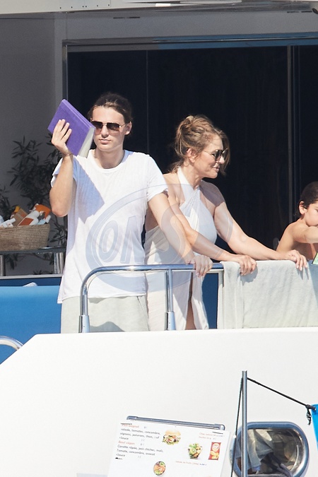 Semi-Exclusif - Prix Spécial - No web - Elizabeth Hurley et son fils Damian, Joan Collins et son mari Percy Gibson passent la journée sur un yacht au large de Saint-Tropez, le 13 août 2024. Si Damian a choisi de se baigner, Elizabeth Hurley semblait hésiter entre plusieurs glaces sur la carte proposée par un marchand itinérant. Récemment, Damian Hurley est passé derrière la caméra pour réaliser le film "Strictly Confidential" avec sa mère dans le rôle principal. Semi-Exclusive - Special Price - No web - Elizabeth Hurley and her son Damian, Joan Collins and her husband Percy Gibson spend the day on a yacht off the coast of Saint-Tropez, August 13, 2024. While Damian chose to go for a swim, Elizabeth Hurley seemed to be hesitating between several ice creams on the menu offered by a traveling vendor. Recently, Damian Hurley stepped behind the camera to direct the film "Strictly Confidential" with his mother in the lead role.
