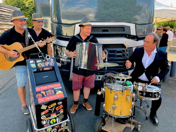 Exclusif - L'ancien président François Hollande joue de la batterie avec le groupe "La petite remorque" à l'arrivée du tour cycliste du Limousin à Argentat-sur-Dordogne le 15 août 2024. © Fabien Faure / Bestimage Exclusive - No web en Suisse / Belgique Former President François Hollande plays drums with the group ‘La petite remorque' at the finish of the Tour Cycliste du Limousin in Argentat-sur-Dordogne on 15 August 2024.