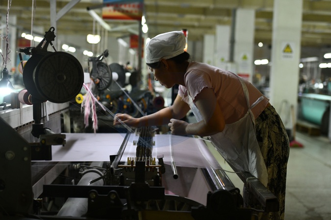 A woman works in a silk weaving factory in Fuyang city in central China's Anhui province Monday, July 15, 2024., Credit:AN MING / Avalon