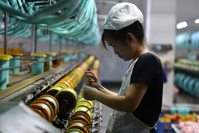 A woman works in a silk weaving factory in Fuyang city in central China's Anhui province Monday, July 15, 2024., Credit:AN MING / Avalon
