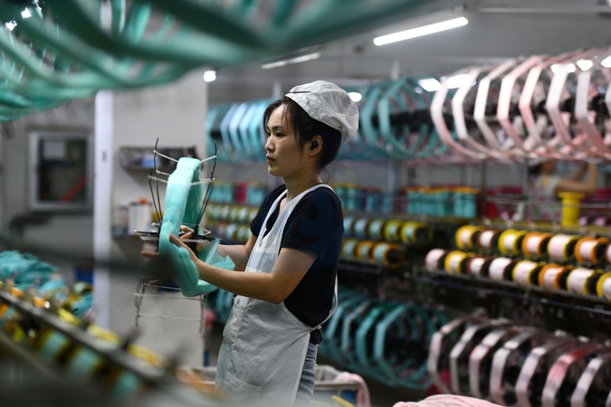 A woman works in a silk weaving factory in Fuyang city in central China's Anhui province Monday, July 15, 2024., Credit:AN MING / Avalon