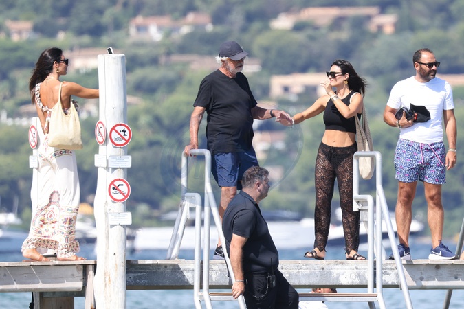 Flavio Briatore et Elisabetta Gregoraci embarquent sur une annexe au Club 55 à Saint-Tropez le 17 août 2024 Flavio Briatore and Elisabetta Gregoraci board a tender at Club 55 in Saint-Tropez on 17 August 2024