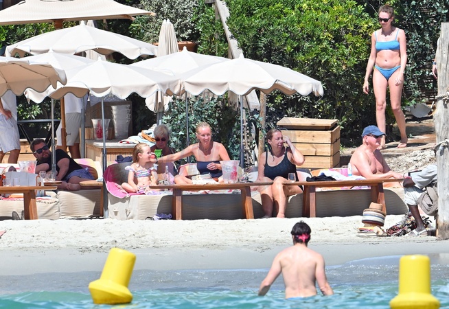 Exclusif - James Corden, sa femme Julia Carey et leur fils Max et des amis à la plage à Saint-Tropez le 19 août 2024. Exclusive - no web - James Corden, his wife Julia Carey and their son Max and friends at the beach in Saint-Tropez