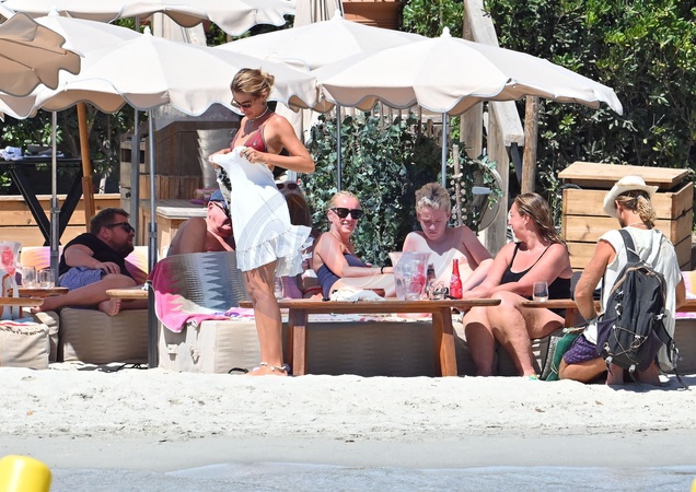 Exclusif - James Corden, sa femme Julia Carey et leur fils Max et des amis à la plage à Saint-Tropez le 19 août 2024. Exclusive - no web - James Corden, his wife Julia Carey and their son Max and friends at the beach in Saint-Tropez