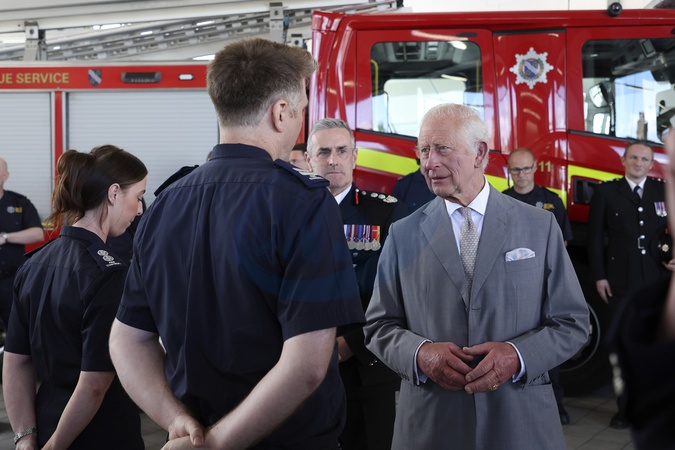 Britain's King Charles visits Community Fire Station in Southport on 20 August 2024