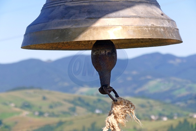 CHERNIVTSI REGION, UKRAINE - JULY 31, 2024 - A bell is seen against the backdrop of the Carpathians Mountains, Vyzhnytsia district, Chernivtsi region, western Ukraine., Credit:Yurii Rylchuk / Avalon