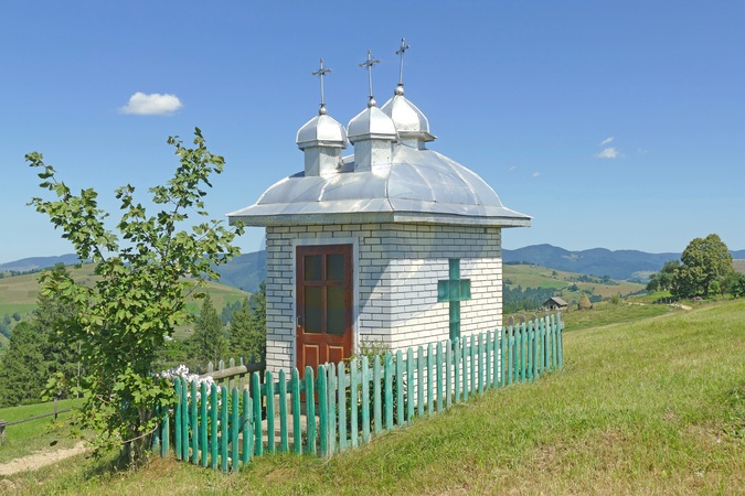 CHERNIVTSI REGION, UKRAINE - JULY 31, 2024 - A chapel is in the Carpathians Mountains in Vyzhnytsia district, Chernivtsi region, western Ukraine., Credit:Yurii Rylchuk / Avalon