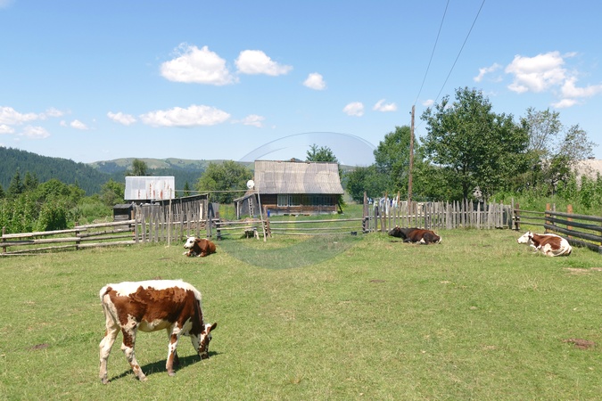 CHERNIVTSI REGION, UKRAINE - JULY 31, 2024 - Cows and calves graze on the grass in an enclosure in the Carpathians Mountains in Vyzhnytsia district, Chernivtsi region, western Ukraine., Credit:Yurii Rylchuk / Avalon