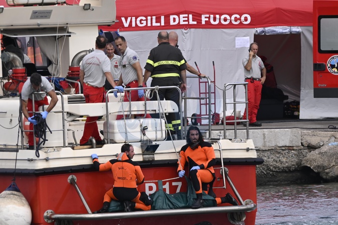 21/08/2024 Firefighters and the Italian Coast Guard recover a body from the sunken sailing vessel in Porticello, Sicily, Italy, August 21, 2024. Six people are still missing and 15 passengers have been rescued, after a 56-meter luxury sailing yacht, the Bayesian, with 22 people on board, sank on August 19 due to a tornado that hit the area., Credit:Valeria Ferraro / Avalon