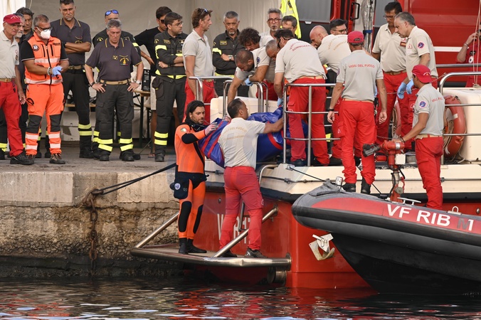 Firefighters and the Italian Coast Guard recover a body from the sunken sailing vessel in Porticello, Sicily, Italy, August 21, 2024. Four people are still missing and 15 passengers have been rescued, after a 56-meter luxury sailing yacht, the Bayesian, with 22 people on board, sank on August 19 due to a tornado that hit the area., Credit:Valeria Ferraro / Avalon