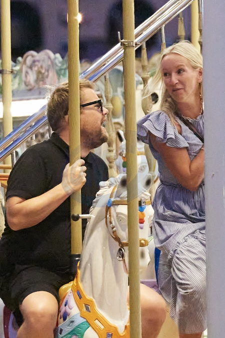 Exclusif - James Corden et sa femme Julia Carey s'amusent lors d'un tour de manège à Saint-Tropez le 20 août 2024. Exclusive - No web en Suisse / Belgique James Corden and his wife Julia Carey enjoy a carousel ride in Saint-Tropez on 20 August 2024.