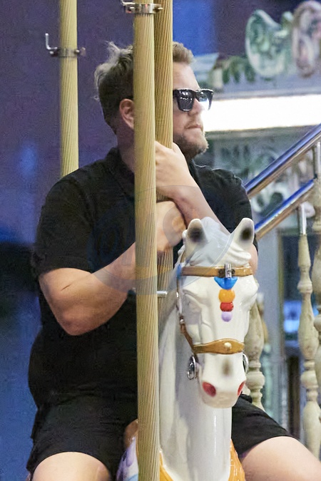 Exclusif - James Corden et sa femme Julia Carey s'amusent lors d'un tour de manège à Saint-Tropez le 20 août 2024. Exclusive - No web en Suisse / Belgique James Corden and his wife Julia Carey enjoy a carousel ride in Saint-Tropez on 20 August 2024.
