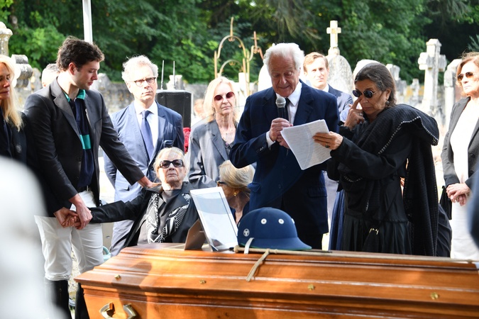 Exclusif - Madame Patrick Guerrand-Hermes, son petit-fils Lucien Guerrand Hermes et famille - Inhumation de Patrick Guerrand-Hermès (Directeur d'Hermès jusque 2012 et patriarche de la famille) au cimetière de Vineuil-Saint-Firmin dans l'Oise le 20 août 2024. Exclusive - Burial of Patrick Guerrand-Hermès (Director of Hermès until 2012 and patriarch of the family) at the Vineuil-Saint-Firmin cemetery in Oise on August 20, 2024.