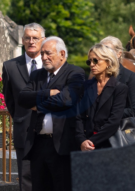 Exclusif - Dominique Strauss-Kahn (DSK) et sa compagne Myriam L'Aouffir - Inhumation de Patrick Guerrand-Hermès (Directeur d'Hermès jusque 2012 et patriarche de la famille) au cimetière de Vineuil-Saint-Firmin dans l'Oise le 20 août 2024. Exclusive - Burial of Patrick Guerrand-Hermès (Director of Hermès until 2012 and patriarch of the family) at the Vineuil-Saint-Firmin cemetery in Oise on August 20, 2024.