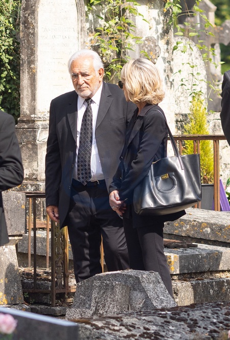 Exclusif - Dominique Strauss-Kahn (DSK) et sa compagne Myriam L'Aouffir - Inhumation de Patrick Guerrand-Hermès (Directeur d'Hermès jusque 2012 et patriarche de la famille) au cimetière de Vineuil-Saint-Firmin dans l'Oise le 20 août 2024. Exclusive - Burial of Patrick Guerrand-Hermès (Director of Hermès until 2012 and patriarch of the family) at the Vineuil-Saint-Firmin cemetery in Oise on August 20, 2024.