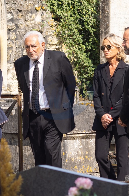 Exclusif - Dominique Strauss-Kahn (DSK) et sa compagne Myriam L'Aouffir - Inhumation de Patrick Guerrand-Hermès (Directeur d'Hermès jusque 2012 et patriarche de la famille) au cimetière de Vineuil-Saint-Firmin dans l'Oise le 20 août 2024. Exclusive - Burial of Patrick Guerrand-Hermès (Director of Hermès until 2012 and patriarch of the family) at the Vineuil-Saint-Firmin cemetery in Oise on August 20, 2024.