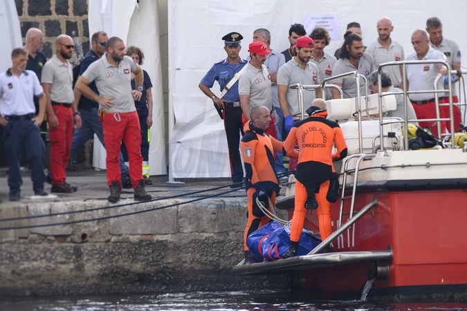 Firefighters and the Italian Coast Guard recover the fifth body from the sailing ship that sank in Porticello. It is the tycoon Mike Lynch, only his daughter Hannah is still missing. Sicily, Italy, August 22, 2024. 15 passengers were rescued after a 56-meter luxury sailing yacht, the Bayesian, with 22 people on board, sank on August 19 due to a tornado that hit the area., Credit:Valeria Ferraro / Avalon