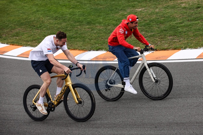 LECLERC Charles (mco), Scuderia Ferrari SF-24, portrait Harrie Lavreysen Cyclist Olympic champion in Paris during the Formula 1 Heineken Dutch Grand Prix 2024, 15th round of the 2024 Formula One World Championship from August 23 to 25, 2024 on the Circuit Zandvoort, in Zandvoort, Netherlands - © Xavi Bonilla / Panoramic / Bestimage