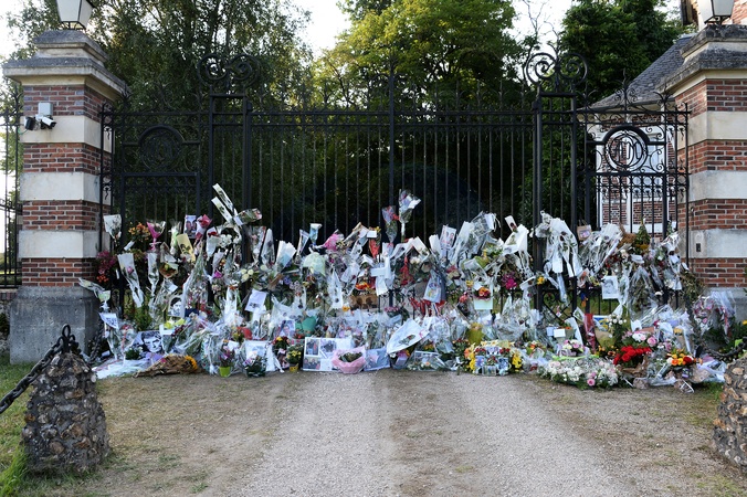Kwiaty i wiadomości pozostawione przez fanów przed posiadłością Alaina Delona na kilka godzin przed pogrzebem aktora, który odbędzie się w kaplicy na jego posiadłości.