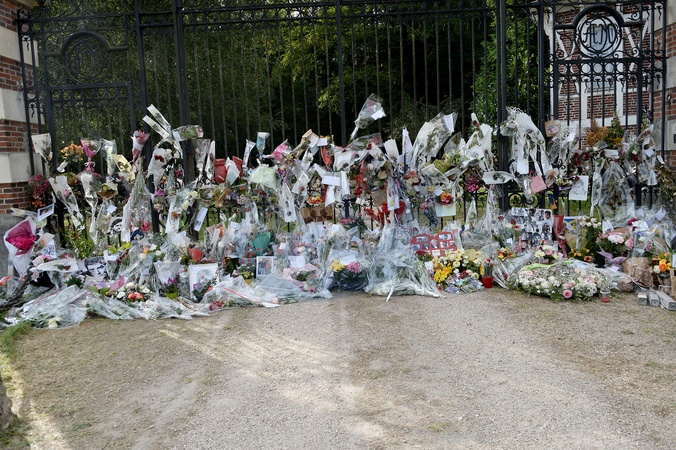 Kwiaty i wiadomości pozostawione przez fanów przed posiadłością Alaina Delona na kilka godzin przed pogrzebem aktora, który odbędzie się w kaplicy na jego posiadłości.