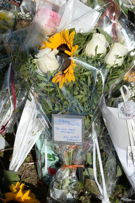 Kwiaty i wiadomości pozostawione przez fanów przed posiadłością Alaina Delona na kilka godzin przed pogrzebem aktora, który odbędzie się w kaplicy na jego posiadłości.