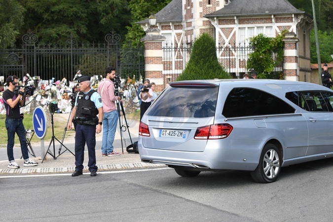 Arrivée du cercueil dans le corbillard à la propriété de Douchy-Montcorbon à quelques heures des obsèques d'Alain Delon