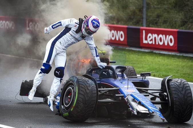 La monoplace de Logan Sargeant (USA) est sortie violemment de la piste et a pris feu lors des essais libres du Grand Prix de F1 des Pays-Bas à Zandvoort, le 24 août 2024. © Florent Gooden / Panoramic / Bestimage SARGEANT Logan (usa), Williams Racing FW46, action, crash, accident, and fire, feu during the Formula 1 Heineken Dutch Grand Prix 2024, 15th round of the 2024 Formula One World Championship from August 23 to 25, 2024 on the Circuit Zandvoort, in Zandvoort, Netherlands