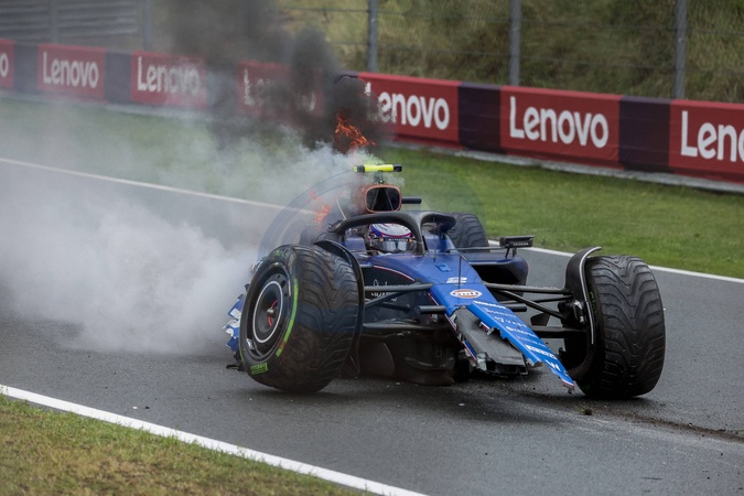 La monoplace de Logan Sargeant (USA) est sortie violemment de la piste et a pris feu lors des essais libres du Grand Prix de F1 des Pays-Bas à Zandvoort