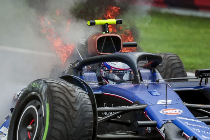 Samochód Logana Sargeanta (USA) brutalnie opuścił tor i zapalił się podczas wolnych treningów przed Grand Prix Holandii F1 w Zandvoort