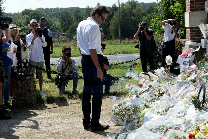 Anthony Delon i jego przyrodni brat Alain-Fabien odkrywają hołdy przed bramą posiadłości Douchy, na kilka godzin przed pogrzebem ich ojca, Alaina Delona