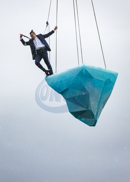 London,UK, 24th Aug 2024. THAW is the European premiere of a performance by Australian physical theatre company Legs On The Wall in response to the devastating bushfires of 2019/20 and global climate change. The performance, taking place at the University of East London's Docklands Campus, brings spectators face to face with the urgent need for global climate action through a performance over 8 hours and sees a performer on a giant melting 2.5 tonne block of ice suspended from a tall crane, with Canary Wharf, City Airport and Woolwich in the backgroud., Credit:Avalon