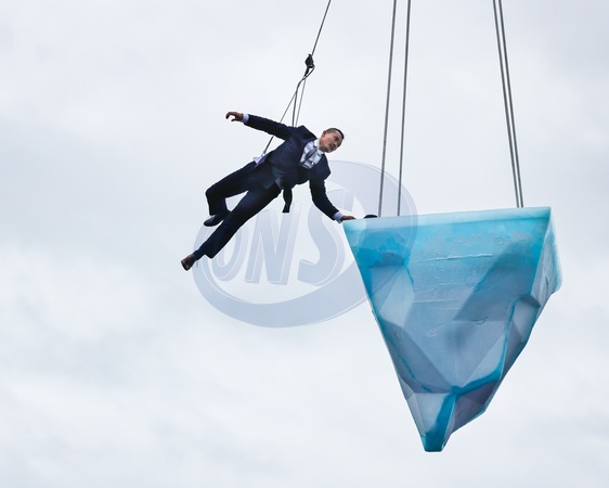 London,UK, 24th Aug 2024. THAW is the European premiere of a performance by Australian physical theatre company Legs On The Wall in response to the devastating bushfires of 2019/20 and global climate change. The performance, taking place at the University of East London's Docklands Campus, brings spectators face to face with the urgent need for global climate action through a performance over 8 hours and sees a performer on a giant melting 2.5 tonne block of ice suspended from a tall crane, with Canary Wharf, City Airport and Woolwich in the backgroud., Credit:Avalon