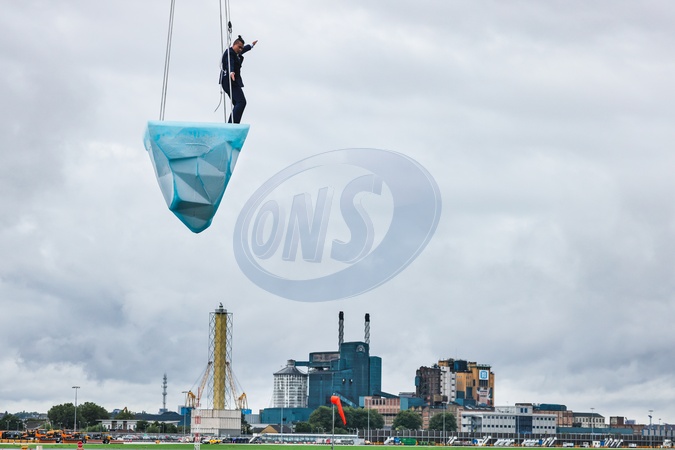 London,UK, 24th Aug 2024. THAW is the European premiere of a performance by Australian physical theatre company Legs On The Wall in response to the devastating bushfires of 2019/20 and global climate change. The performance, taking place at the University of East London's Docklands Campus, brings spectators face to face with the urgent need for global climate action through a performance over 8 hours and sees a performer on a giant melting 2.5 tonne block of ice suspended from a tall crane, with Canary Wharf, City Airport and Woolwich in the backgroud., Credit:Avalon