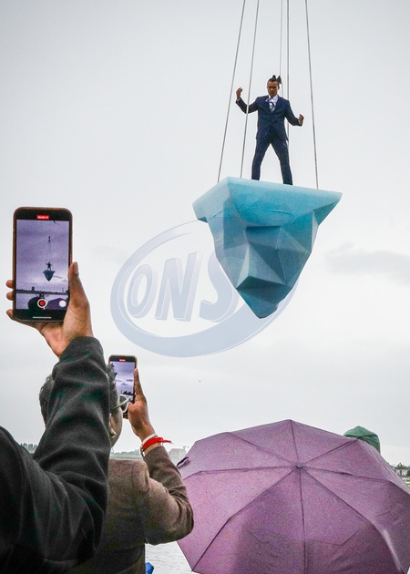 London,UK, 24th Aug 2024. THAW is the European premiere of a performance by Australian physical theatre company Legs On The Wall in response to the devastating bushfires of 2019/20 and global climate change. The performance, taking place at the University of East London's Docklands Campus, brings spectators face to face with the urgent need for global climate action through a performance over 8 hours and sees a performer on a giant melting 2.5 tonne block of ice suspended from a tall crane, with Canary Wharf, City Airport and Woolwich in the backgroud., Credit:IMAGEPLOTTER / Avalon