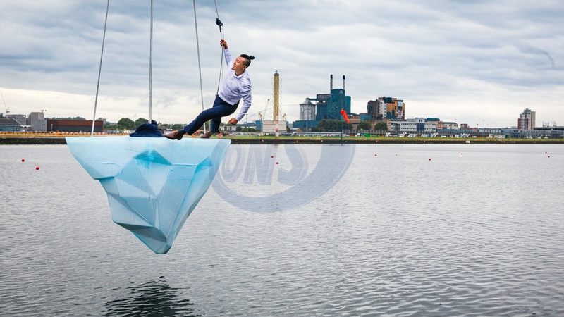 London,UK, 24th Aug 2024. THAW is the European premiere of a performance by Australian physical theatre company Legs On The Wall in response to the devastating bushfires of 2019/20 and global climate change. The performance, taking place at the University of East London's Docklands Campus, brings spectators face to face with the urgent need for global climate action through a performance over 8 hours and sees a performer on a giant melting 2.5 tonne block of ice suspended from a tall crane, with Canary Wharf, City Airport and Woolwich in the backgroud., Credit:IMAGEPLOTTER / Avalon