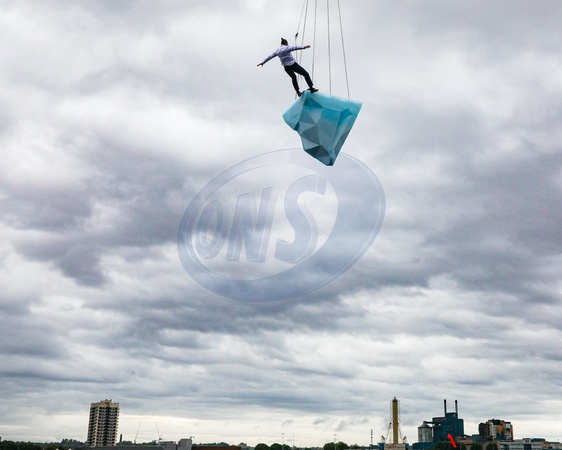 London,UK, 24th Aug 2024. THAW is the European premiere of a performance by Australian physical theatre company Legs On The Wall in response to the devastating bushfires of 2019/20 and global climate change. The performance, taking place at the University of East London's Docklands Campus, brings spectators face to face with the urgent need for global climate action through a performance over 8 hours and sees a performer on a giant melting 2.5 tonne block of ice suspended from a tall crane, with Canary Wharf, City Airport and Woolwich in the backgroud., Credit:IMAGEPLOTTER / Avalon