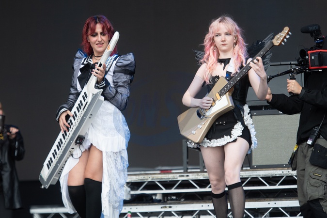 Keyboardist Aurora Nishevci and lead guitarist Emily Roberts of English indie rock band The Last Dinner Party performs on the Main Stage at Reading Festival 2024, Little John's Farm, Reading, England, UK on Saturday 24 August 2024., Credit:Justin Ng / Avalon