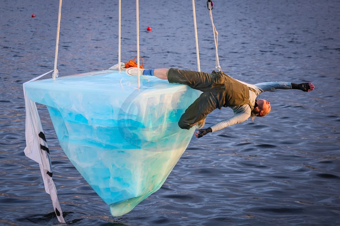 London,UK, 24th Aug 2024. 3rd performance, performer: Anna. THAW is the European premiere of a performance by Australian physical theatre company Legs On The Wall in response to the devastating bushfires of 2019/20 and global climate change. The performance, taking place at the University of East London's Docklands Campus, brings spectators face to face with the urgent need for global climate action through a performance over 8 hours and sees a performer on a giant melting 2.5 tonne block of ice suspended from a tall crane, with Canary Wharf, City Airport and Woolwich in the backgroud., Credit:Avalon