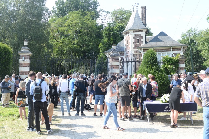 Les fans rendent hommage à Alain Delon devant la grille de sa propriété à Douchy-Montcorbon pendant ses obsèques le 24 août 2024. Fans pay tribute to Alain Delon in front of the gate of his property in Douchy-Montcorbon during his funeral on August 24, 2024.