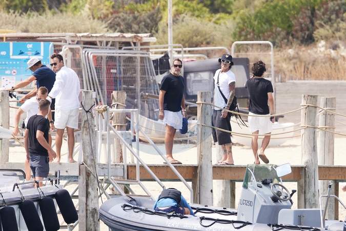 Exclusif - Prix Spécial - No web - Tommy Lee, 61 ans, et ses fils Brandon, 28 ans, et Dylan, 26 ans, arrivent sur une plage de Saint-Tropez pour aller déjeuner, le 25 août 2024. Exclusive - Special Price - No web - Tommy Lee, 61, and his sons Brandon, 28, and Dylan, 26, arrive at a beach in Saint-Tropez for lunch on August 25, 2024.