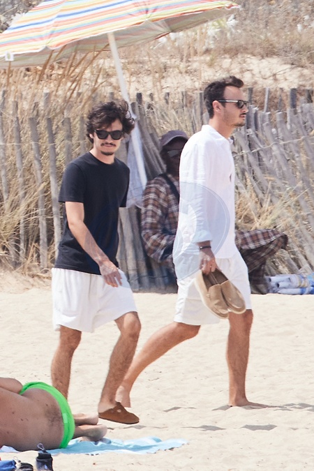 Exclusif - Prix Spécial - No web - Tommy Lee, 61 ans, et ses fils Brandon, 28 ans, et Dylan, 26 ans, arrivent sur une plage de Saint-Tropez pour aller déjeuner, le 25 août 2024. Exclusive - Special Price - No web - Tommy Lee, 61, and his sons Brandon, 28, and Dylan, 26, arrive at a beach in Saint-Tropez for lunch on August 25, 2024.