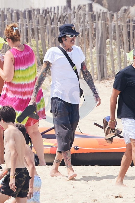 Exclusif - Prix Spécial - No web - Tommy Lee, 61 ans, et ses fils Brandon, 28 ans, et Dylan, 26 ans, arrivent sur une plage de Saint-Tropez pour aller déjeuner, le 25 août 2024. Exclusive - Special Price - No web - Tommy Lee, 61, and his sons Brandon, 28, and Dylan, 26, arrive at a beach in Saint-Tropez for lunch on August 25, 2024.