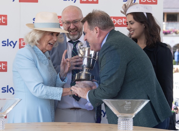 HM Queen presents the Cup to the winners of the Ebor Handicap..He winning horse was No8 Magical Zoe.Ridden by Joe Lee.Owners - Patrick and Scott (pictured right) BrycelandTrainer Henry de Bromhead.Her Majesty The Queen, as Patron of York Racecourse, attends the Ebor Festival and open the racecourseâs latest development.24/08/2024, Credit:JULIAN SIMMONDS / Avalon
