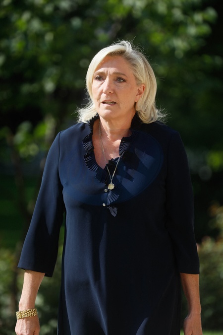 Marine Le Pen et J.Bardella arrivent à l'Elysée pour un entretien avec le président de la République le 26 août 2024. © Christophe Clovis / Bestimage