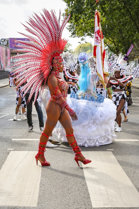 London,UK, 26th Aug 2024. Dancers crossing the road in costume. Participants with the Paraiso School of Samba, one of the largest groups with nearly 200 performers and musicians, get from early morning until the start of the procession at noon. Notting Hill Carnival on Monday sees the main carnival procession of mas bands, drummers and Caribbean and South American Salsa, Samba and Soca groups. Revellers celebrate the Bank Holiday Weekend participating or watching along the carnival route, at sounds systems, stalls and venues on the second of two days of Notting Hill Carnival festivities., Credit:Avalon